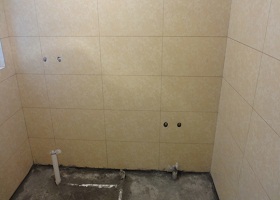 ● 墻地磚鋪貼前應(yīng)放水平標(biāo)志線定位,施工過程中墻磚應(yīng)掛垂線,地磚應(yīng)拉井字線