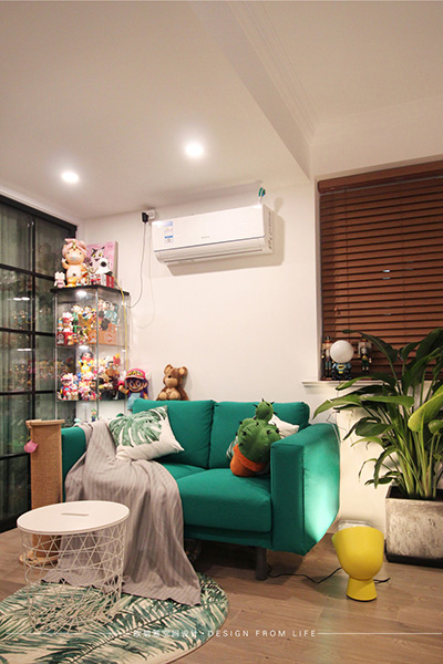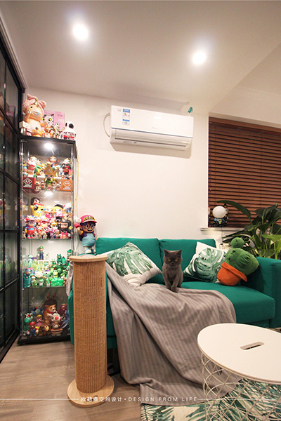 兩位業(yè)主都有一顆童真未泯的心、不僅喜愛寵物還喜歡收集各類模型、玩具,可別看這些小小的卡通布偶哦,它們可是價(jià)值不菲,也是兩位業(yè)主的珍藏寶貝。所以設(shè)計(jì)師在幫業(yè)主解決了客廳空間問題的同時(shí)還特別將業(yè)主喜好的裝修元素進(jìn)行了融合,整個(gè)房間色調(diào)豐富又可愛。